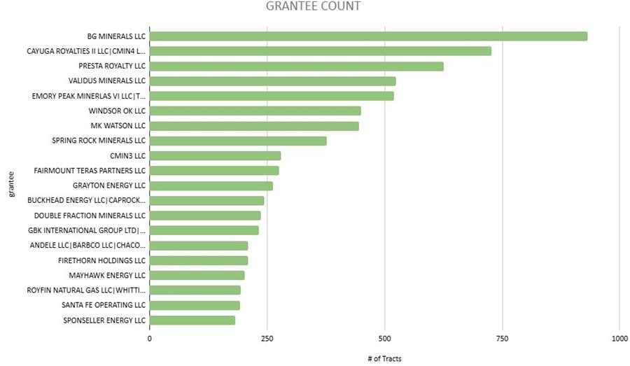 The Top Grantee chart is based on the number of tracts (STRs) acquired, not mineral acres. Tract count isn’t a perfect measure of capital deployed. One STR with 0.25 net mineral acres is weighted the same as an STR with 250 net mineral acres.