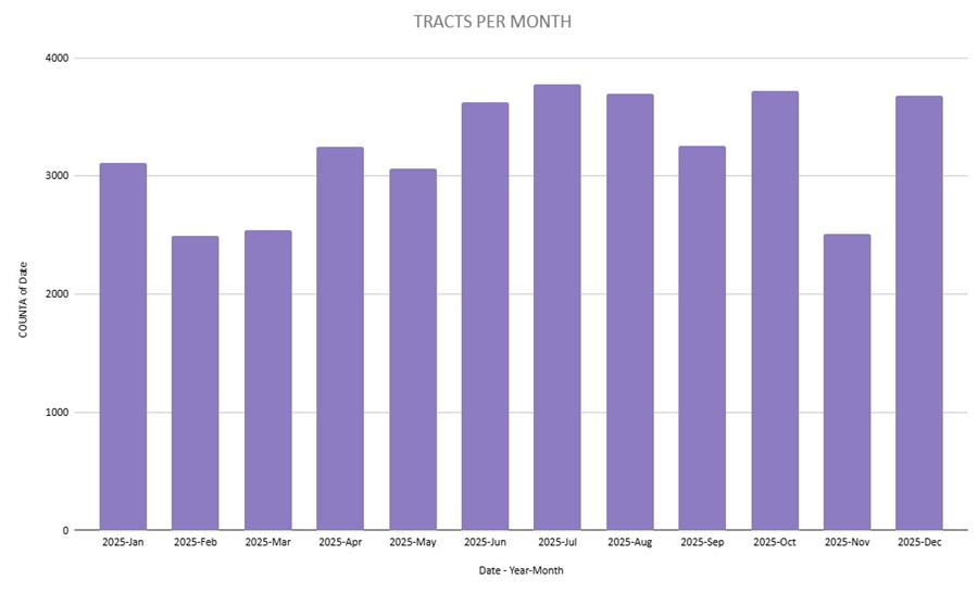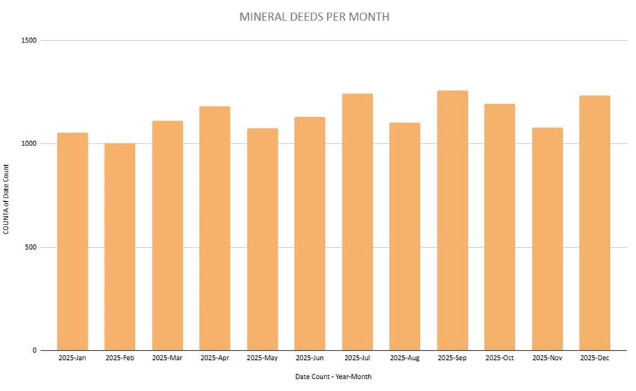 The charts below illustrate monthly trends in the number of mineral deeds filed and the number of tracts (STRs) acquired within those deeds. Please note that tract count does not directly translate to acreage.